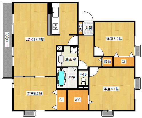 間取り詳細 洋8.1×洋6.3×洋6.2×LDK17.7