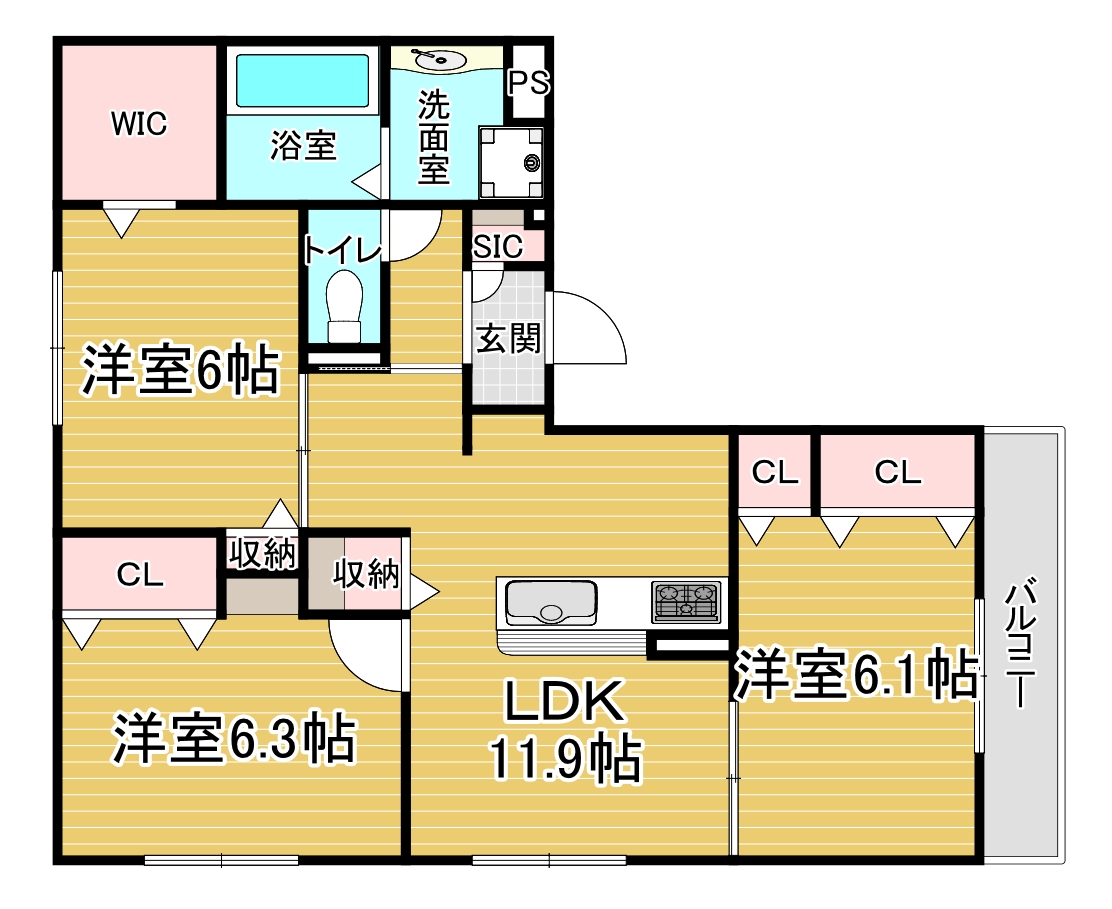 間取り詳細 洋6.3×洋6.1×洋6×LDK11.9