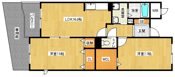 エアコン/角部屋/フローリング/専用庭/W.INクローゼット/自転車/バス・トイレ洗面別/シャワー/シャンプー・ドレッサー付洗面台/追い焚き風呂/室内洗濯機置場/BS/インターネット高速回線/ガス(プロパン)/オートロック/二口ガスコンロ設置可/ |