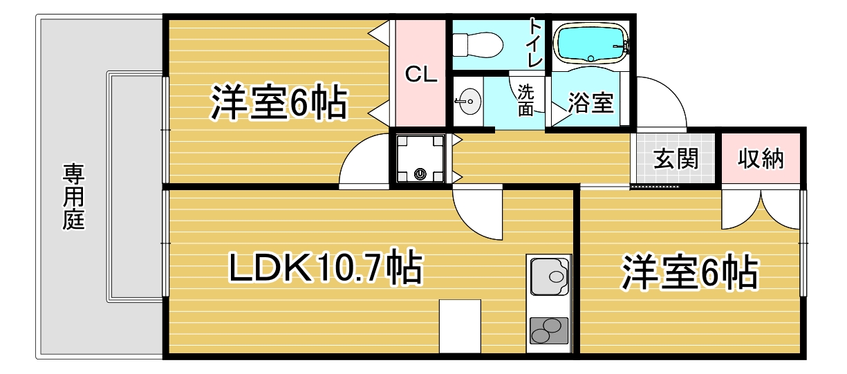 エアコン/防犯シャッター/フローリング/専用庭/自転車/バス・トイレ洗面別/シャワー/シャンプー・ドレッサー付洗面台/室内洗濯機置場/ガス(都市)/二口ガスコンロ設置可/ |